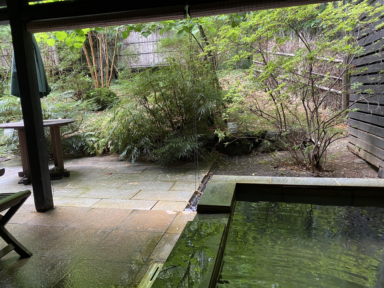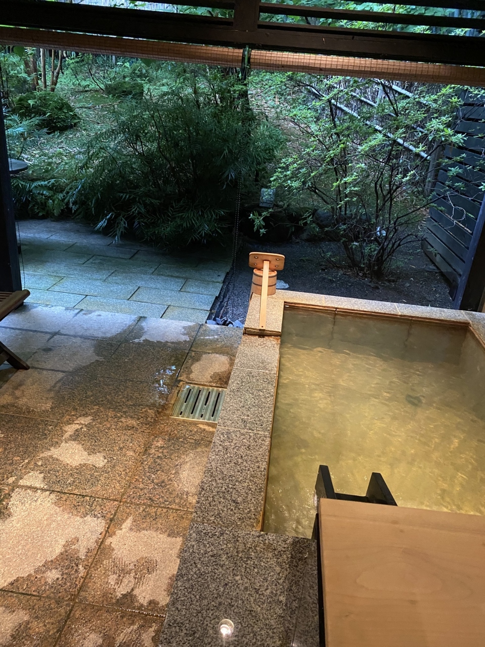 部屋には源泉掛け流しの露天風呂がついており24時間いつでも利用できます。