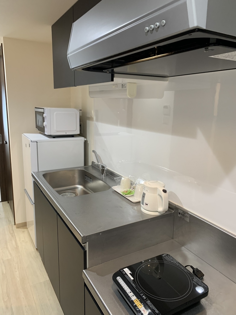 部屋にはテレビ、冷蔵庫、エアコン、電気ポット、電子レンジ、洗濯・乾燥機、ドライヤー、アメニティ類があり、wifi環境も良かったです。ミニキッチンはありましたが、調理器具はなかったので有料レンタルかもしれません。