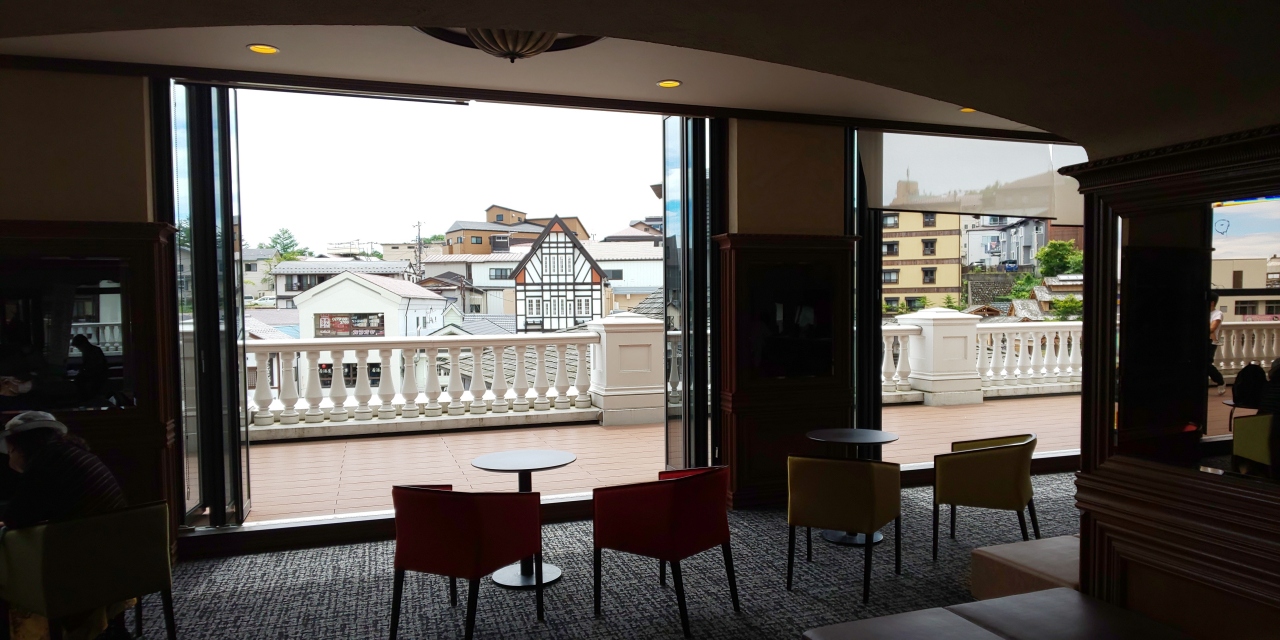 ロビーのテラスから湯畑やライトアップを眺められるのは良いです。