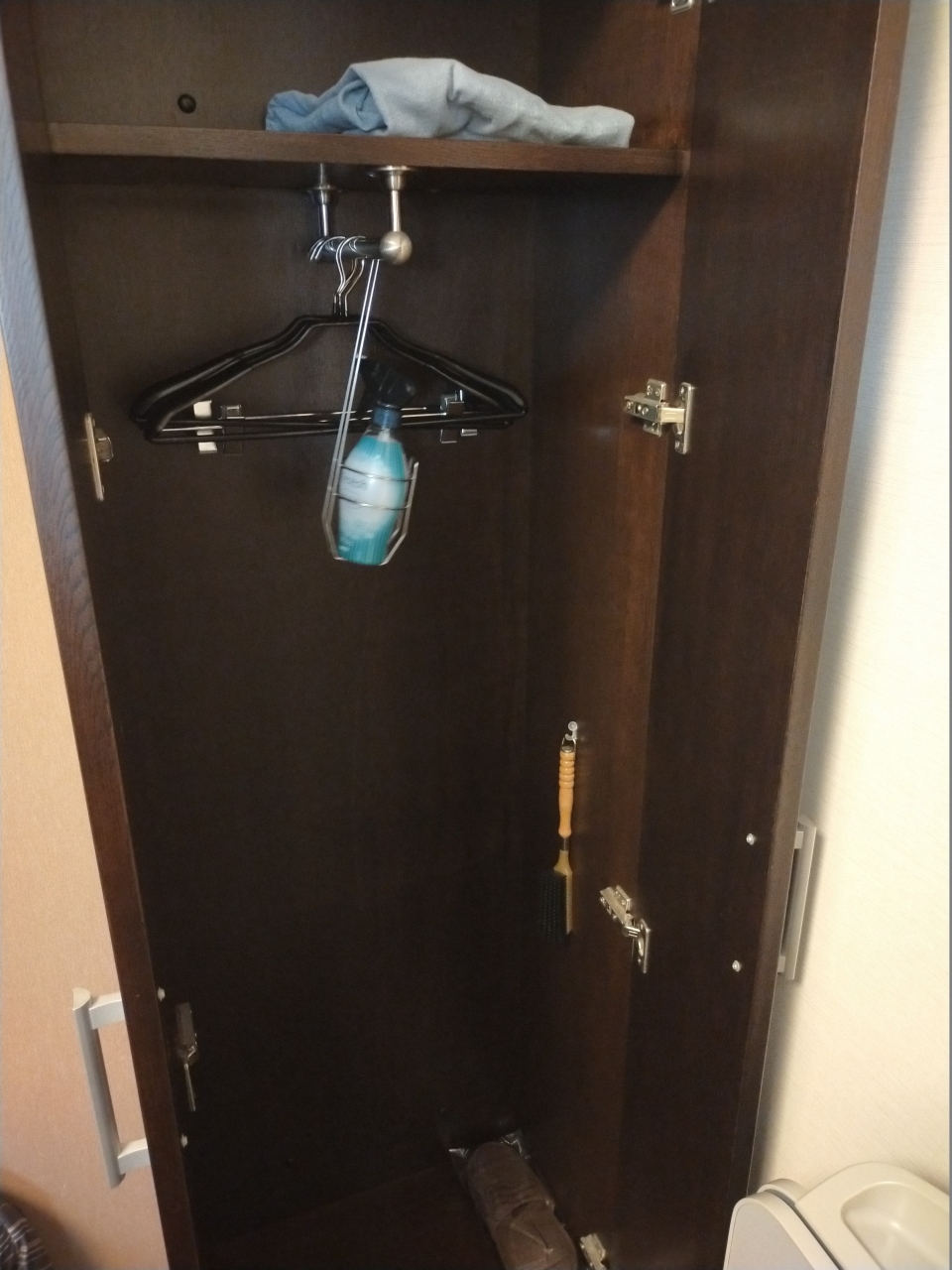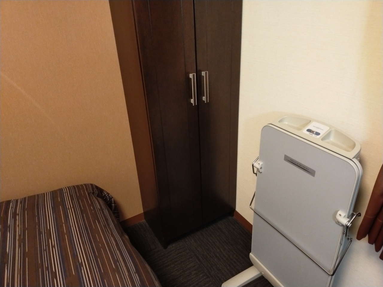 室内は小型のハンガー・チェスト、プレッサー、空気清浄機など設備・アイテムは万全、またデスク回り、入口、冷蔵庫脇、ベッドサイドとコンセントも豊富。