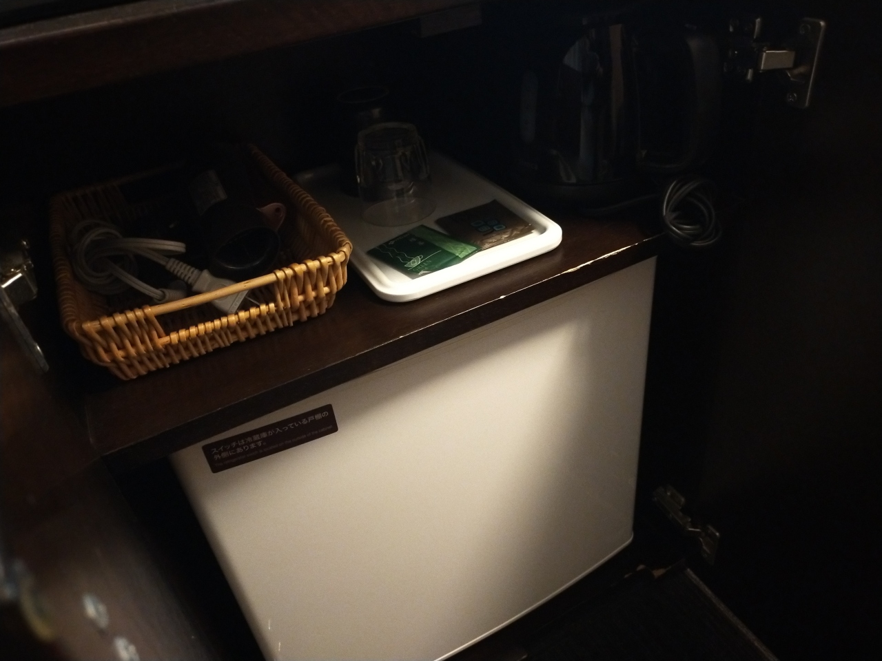 デスク脇に湯沸かしポットと冷蔵庫(空)、ドライヤーが備わった戸棚。