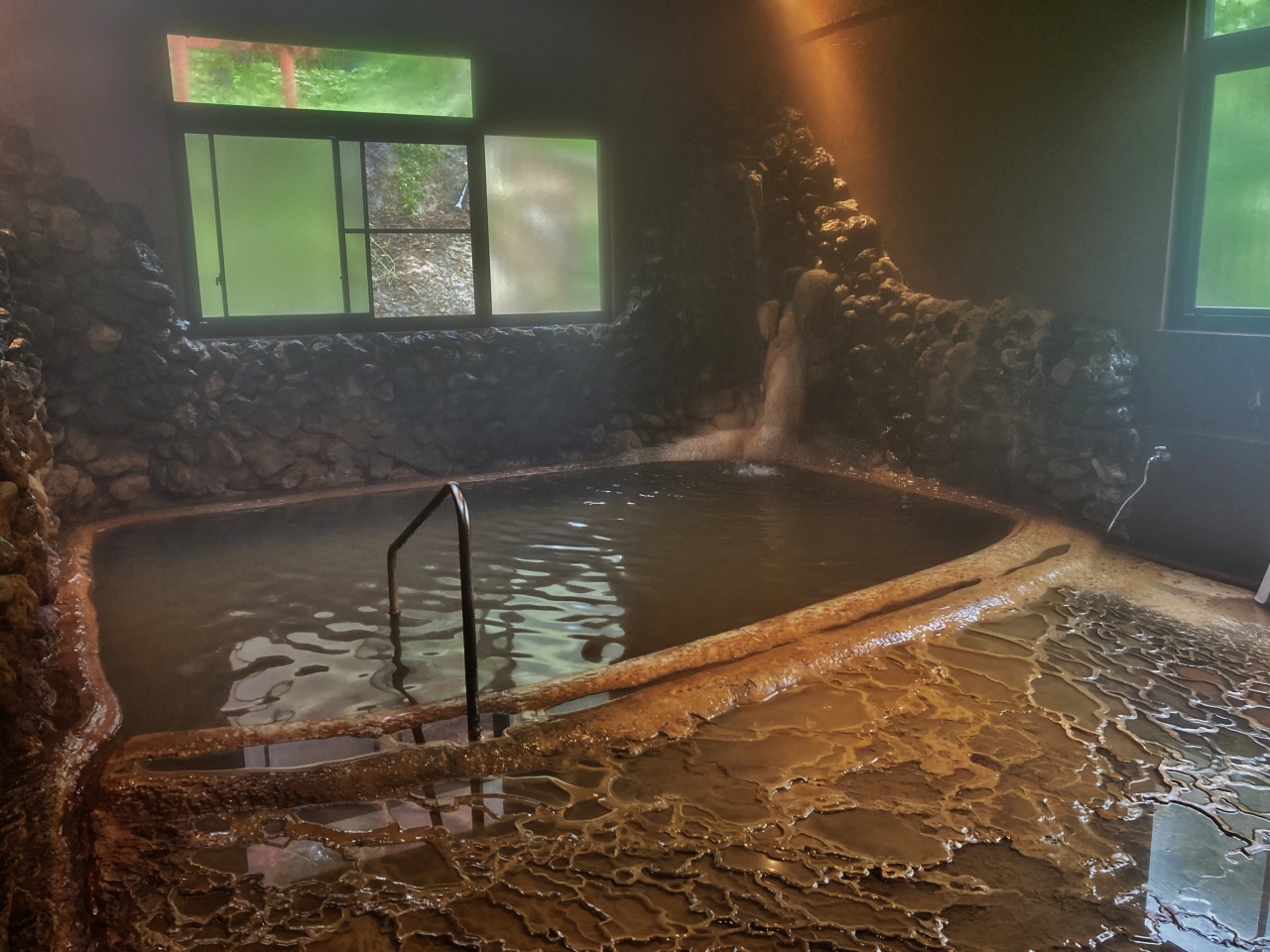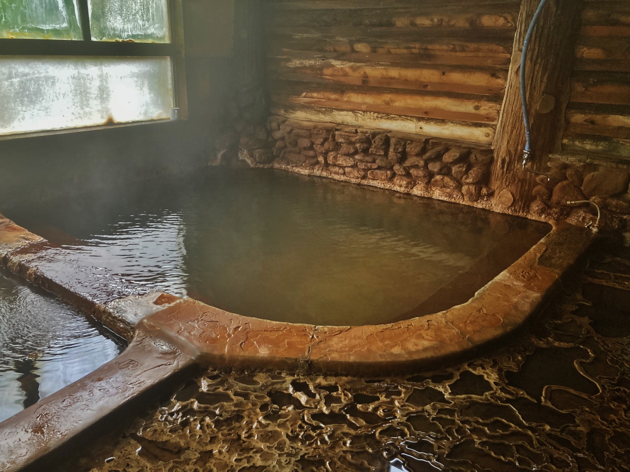 一覧を見る浴室床の湯華が石化した分厚い段が物語る 開湯800年を誇る北海道最古の温泉