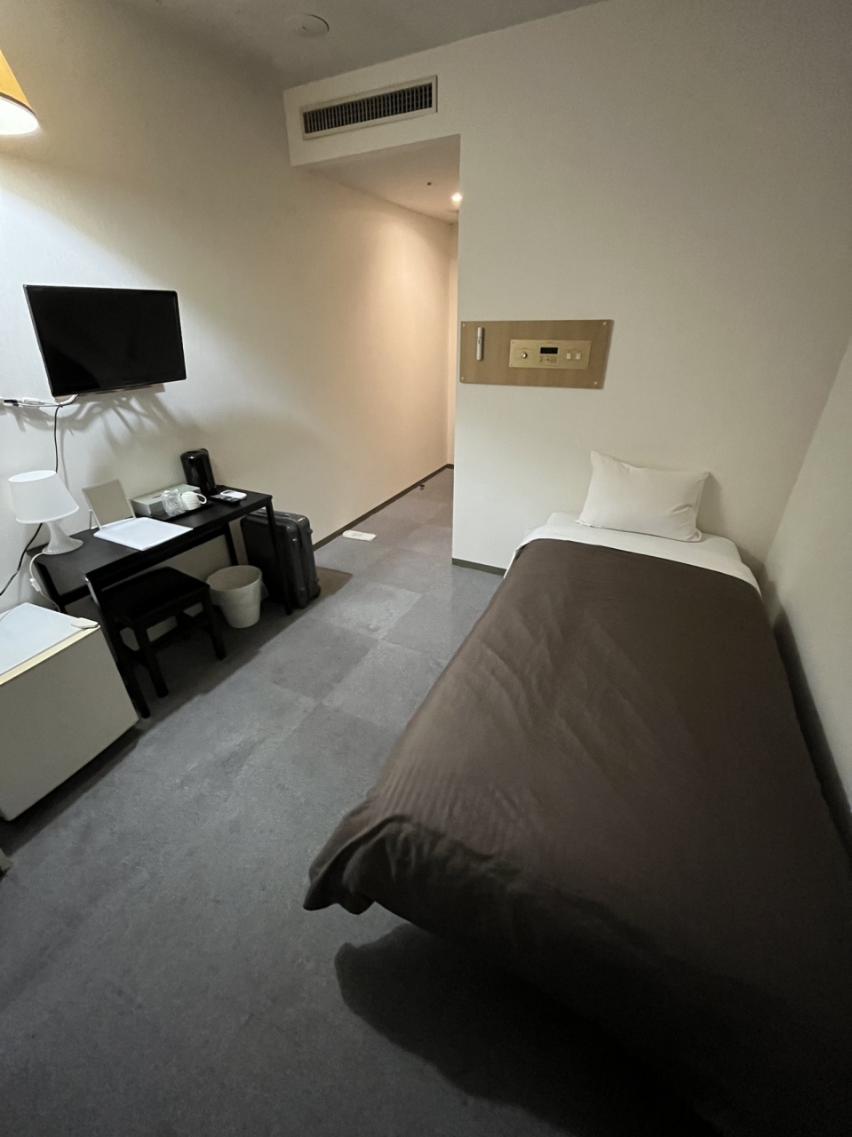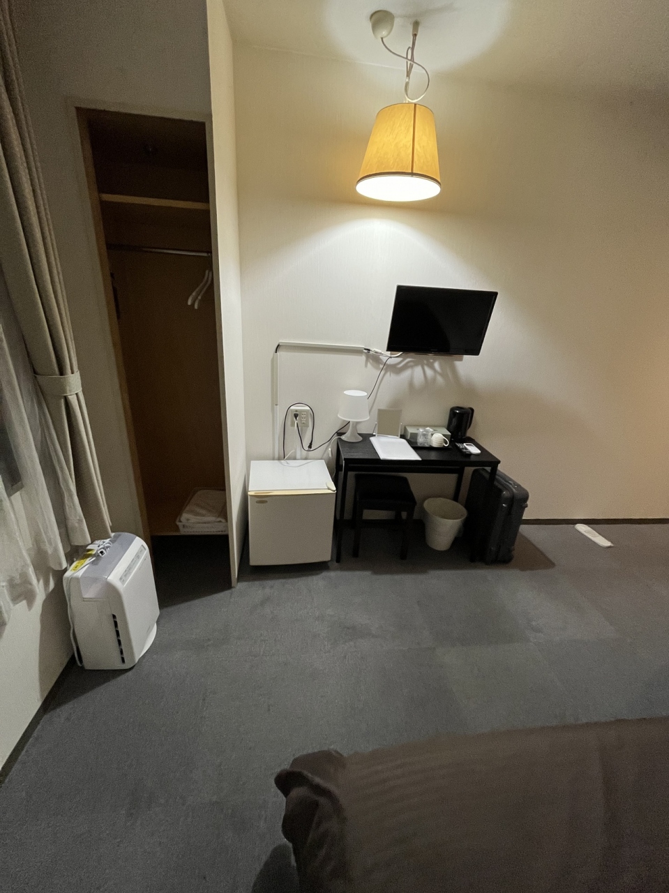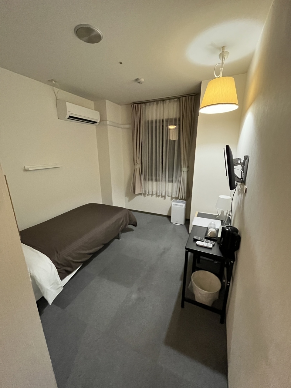 広めだがベッドがスモールシングルで変な感じでした。内線電話ないと思ったら壁掛け型でした