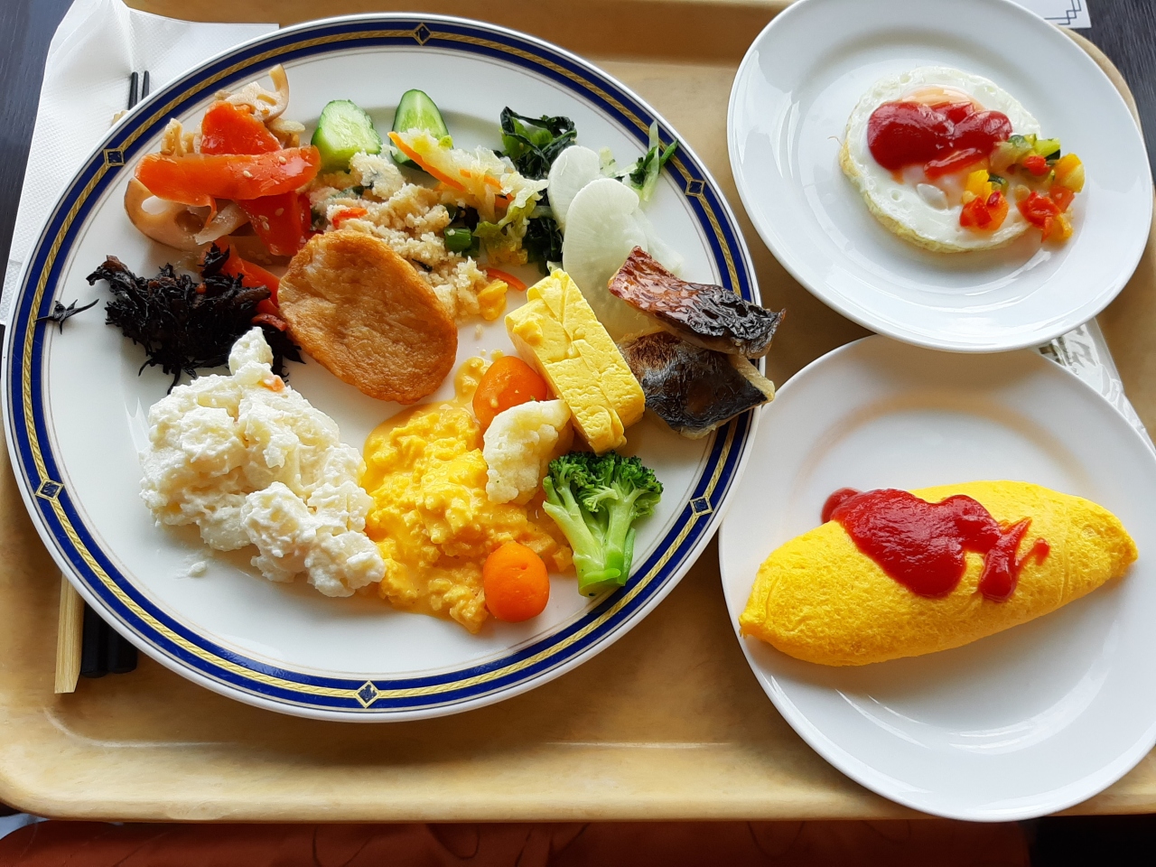 洗面所が広くてハンドソープが良い香りでしたがコスメ類のアメニティーは有りませんでした。無料のお水は重宝しました。朝食は種類は多くは無いですがパンやお漬物、焼き魚のクオリティーが良かったです。ライブキッチンのオムレツに添える野菜も美味しく満足です。