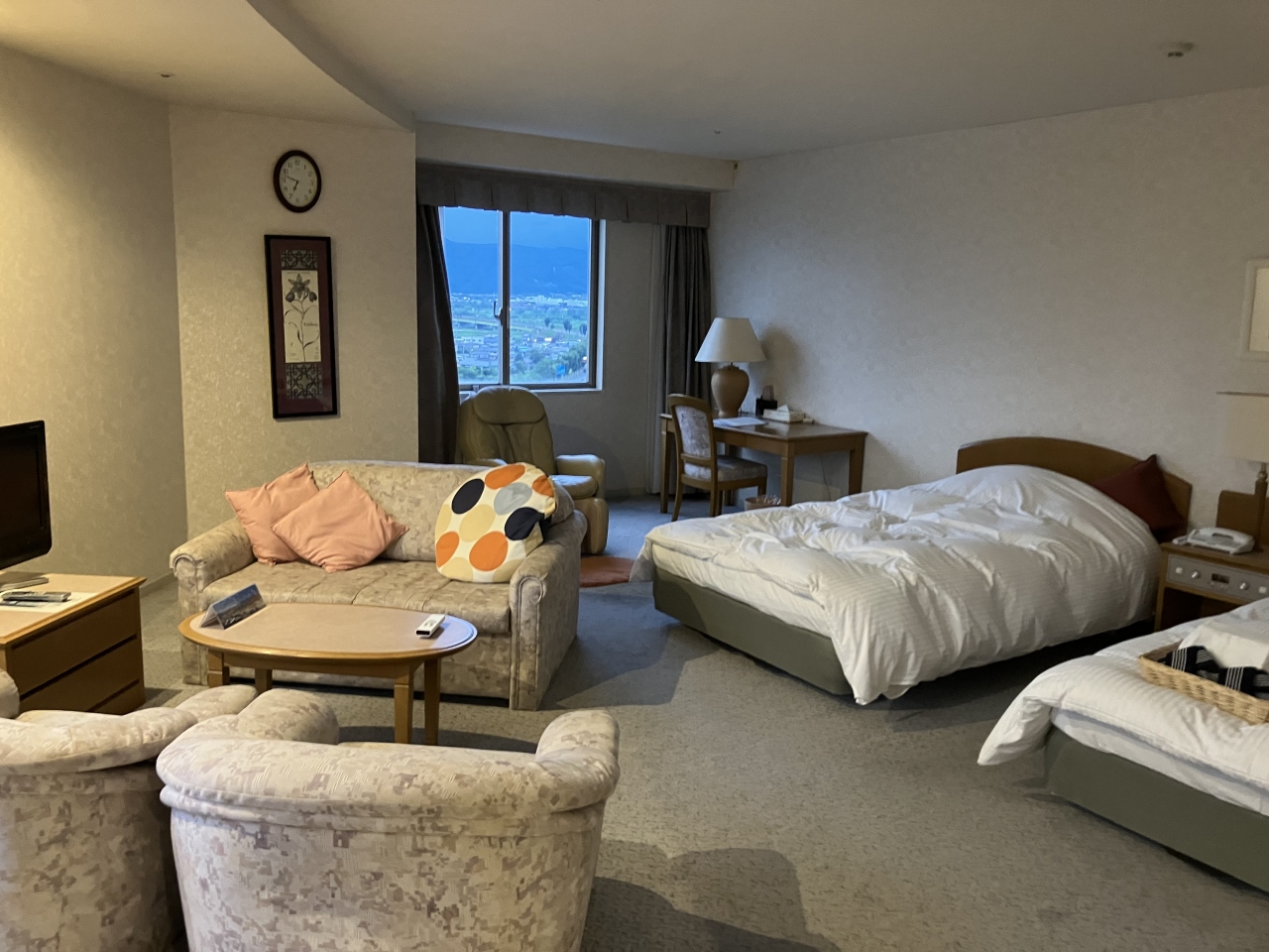 部屋は11階のピースフルルーム(ツイン 55平米)で、景色も良く広めで、古目でしたがマッサージチェアも設置されていて、ゆっくりとくつろげました。