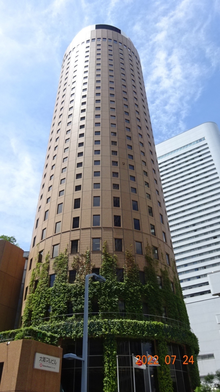 大阪駅、梅田駅から徒歩約5分位です。大阪マルビルと一体の円筒形のホテルです。