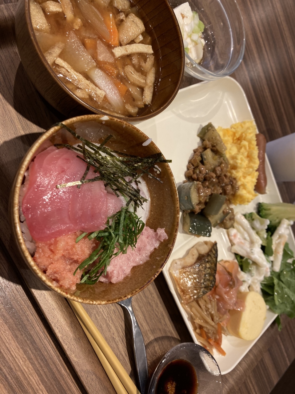 朝食だけ利用しました。レストランは入口すぐ横のため、宿泊者以外でも利用しやすかったです。ビュッフェ台に並ぶのは、サラダ、焼き魚、卵焼き、カレーなどの他、マグロやとろろ、明太子などもあって、マグロ丼が作れるのが良かったです。
