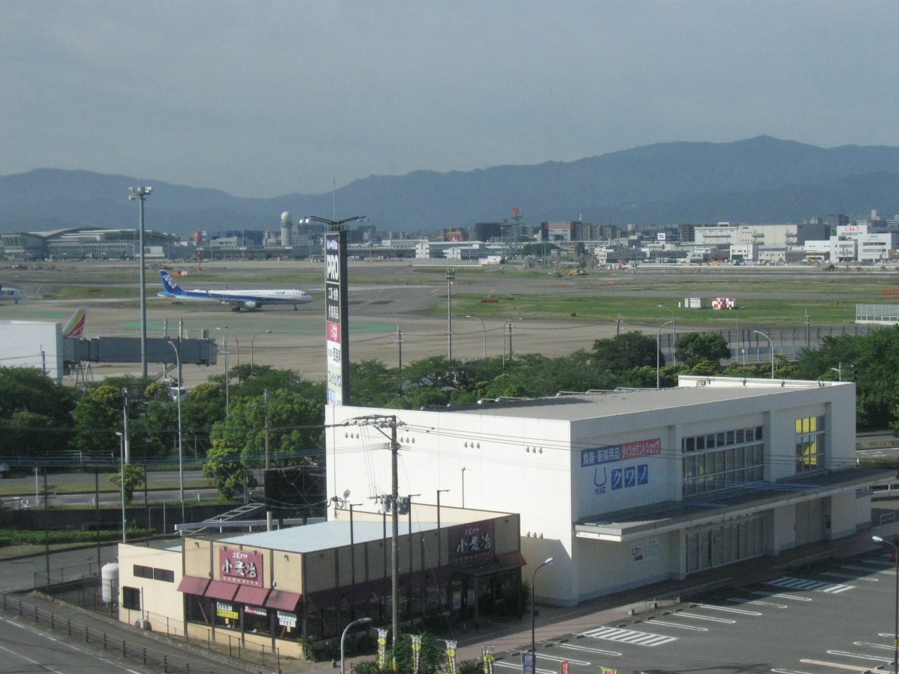 国内線ターミナルから出て左(北)へ少し行ったところに、スロープ付きの人道橋がありますのでそれを最後まで渡り切ります。そこから民間駐車場の大通側を回り込めばもう目の前にあります。普通に歩いて10分掛からないと思います。