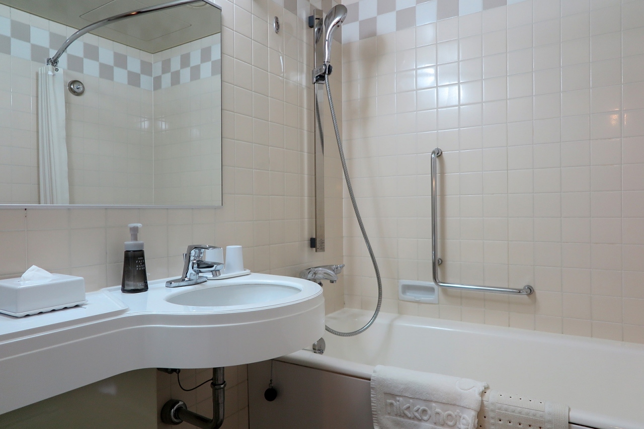 - 古いデザインのユニットバスですが、質感は低くなく、シャワーヘッドは新しいもの、バスアメニティにコーセーのメンズ基礎化粧品に入浴剤