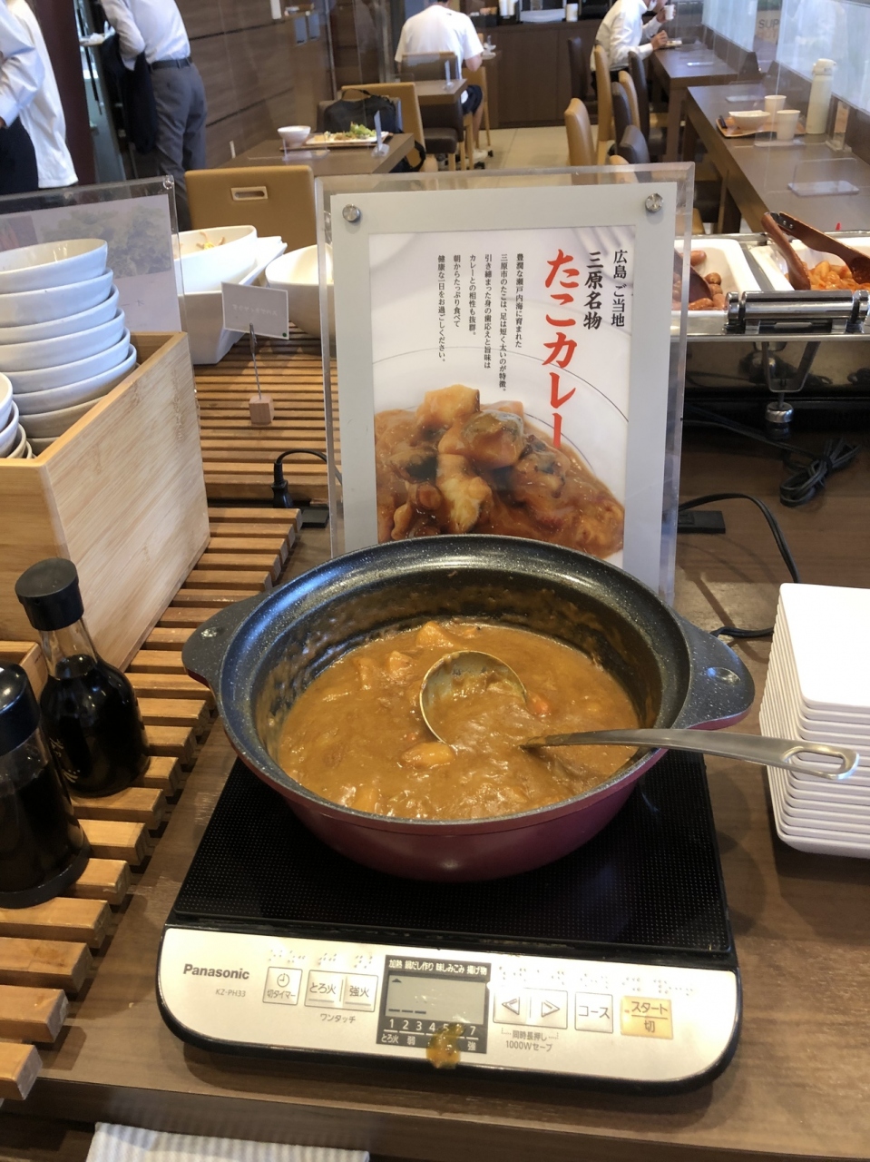 三原駅に着く2時間前ぐらいに予約しました。楽天トラベルで6480円。駅に着くとワイン色のイオンの看板の横に黄色の看板が見え、わーって感じ。5分位歩いてすぐです。温泉は広くないけど1人だけで極楽極楽。朝も入りました。無料朝食も朝一に行ったら焼き立てパン美味しかった。ご飯も食べました。大きな赤玉子。多分美味しいと思う。私は生が苦手なので、、焼きサバも塩辛くなく美味しい。カレーは食べるつもりなかったけど名物のタコが入ってるから少し食べました。スタッフの人が優しくて温かい