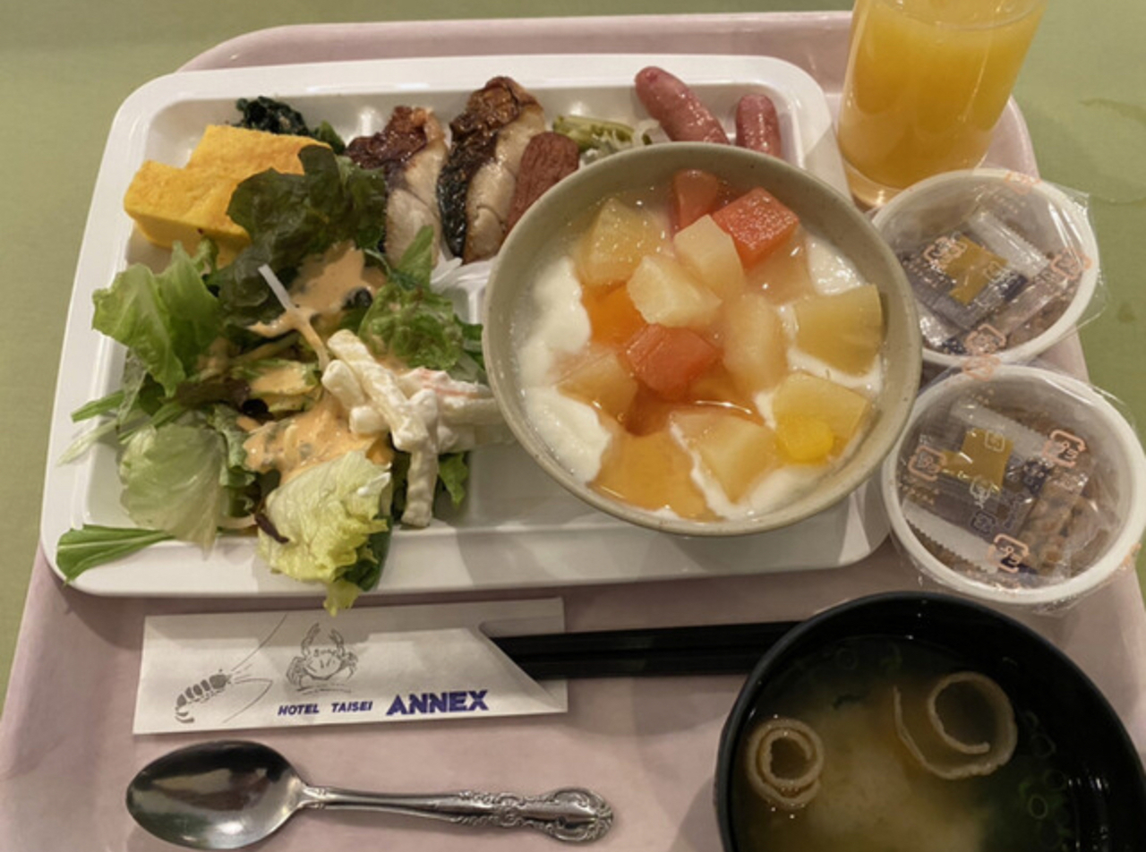 鹿児島中央駅から徒歩10分弱、「ホテルタイセイ」です。朝食は550円。郷土料理メニューはさつま揚げぐらいで特筆すべきメニューはありませんが、このお値段ならお値打ちです。お野菜をたくさんいただくことができました。