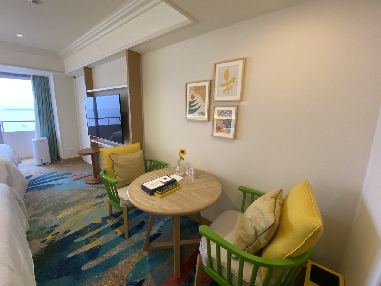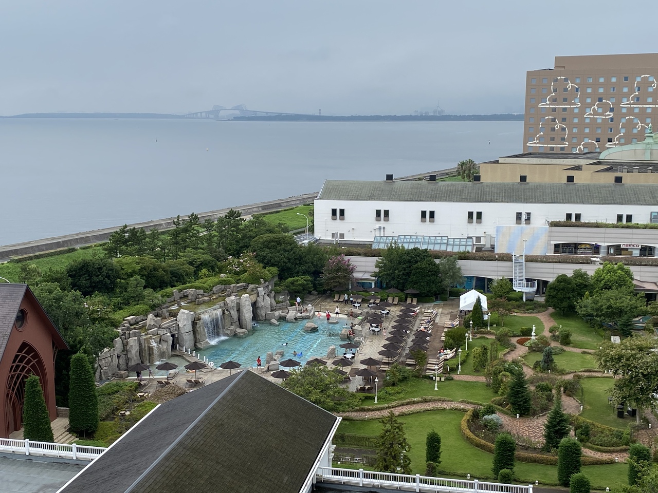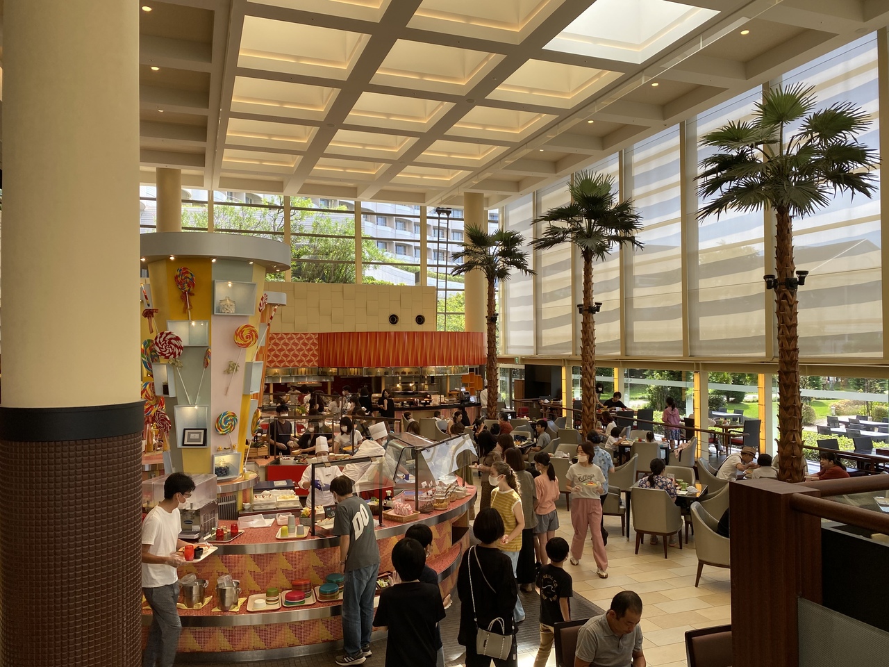 夜はラウンジで。朝食も無料チケットが特典でした。夏休み中でしたので、家族で楽しまれている方が多く、大浴場も混み合っていました。朝食のバイキングは小さなお子さま向けに、カウンターが低いコーナーがあり食器もカラフルで割れないものでした。部屋はディズニーランド側と海側とあり、希望があれば前もって希望されると良いかとおもいます。