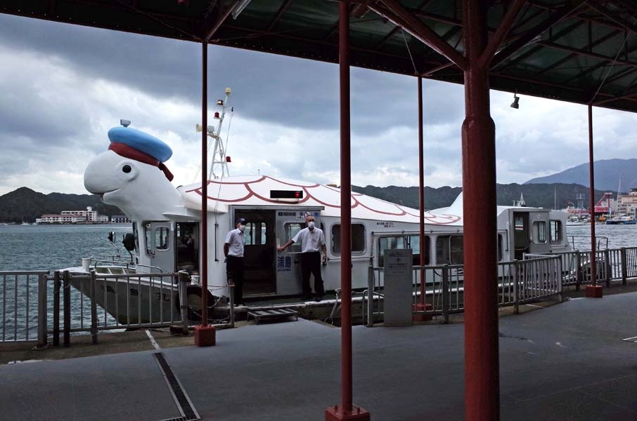 指定駐車場に車を泊めて、マイクロバスに乗換え地下玄関に行きますが、港で降ろしてもらって渡船でホテルに行きました。船で渡るのは楽しかったです。