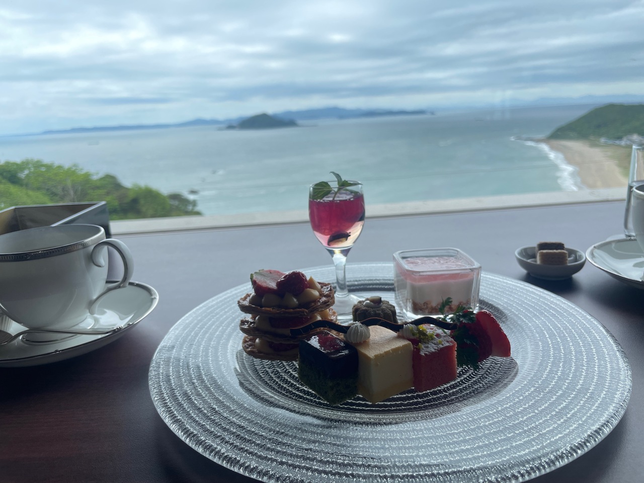 愛知県渥美半島の先、丘の上にあるホテルです。太平洋と半島の美しい景色を見下ろすことができます。ロビーラウンジでは、素敵な景色を見ながら、ケーキセットをいただきました。エレベーターで展望台へ行くと、さらに景色を楽しむことができました。