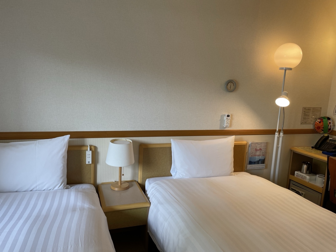 ここは網走駅の目の前で立地もよく、部屋も清潔ですし快適に滞在できました。携帯の充電用に枕元にコンセントがあるホテルが多くなっていますが、この部屋のベッドにも延長コードでコンセントがあと付けされていて、ホテル側の配慮を感じました。