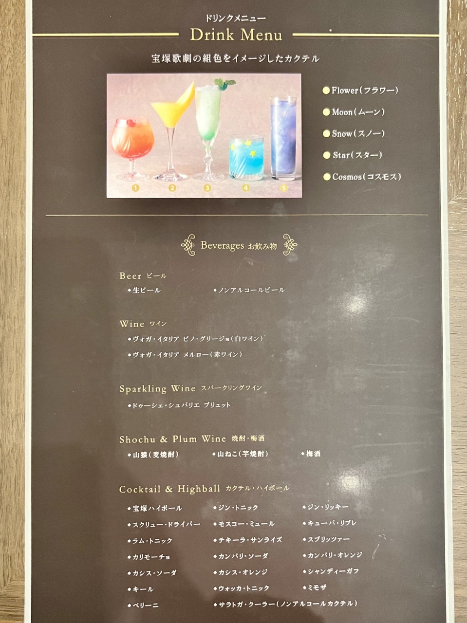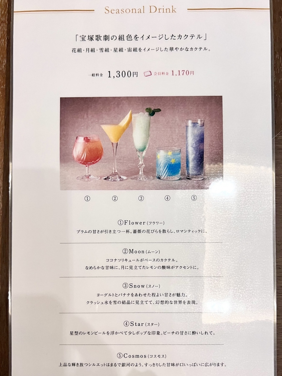 宝塚歌劇の5組をイメージした組カラーのカクテルもフリードリンクに含まれるので、とてもお得に楽しむことが出来ました。