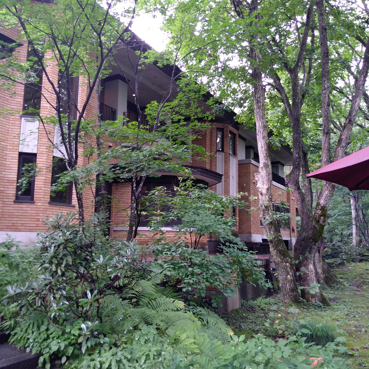 森林に囲まれた、こじんまりとしたホテルです。チェックインは、ロビーのソファに座って行います。