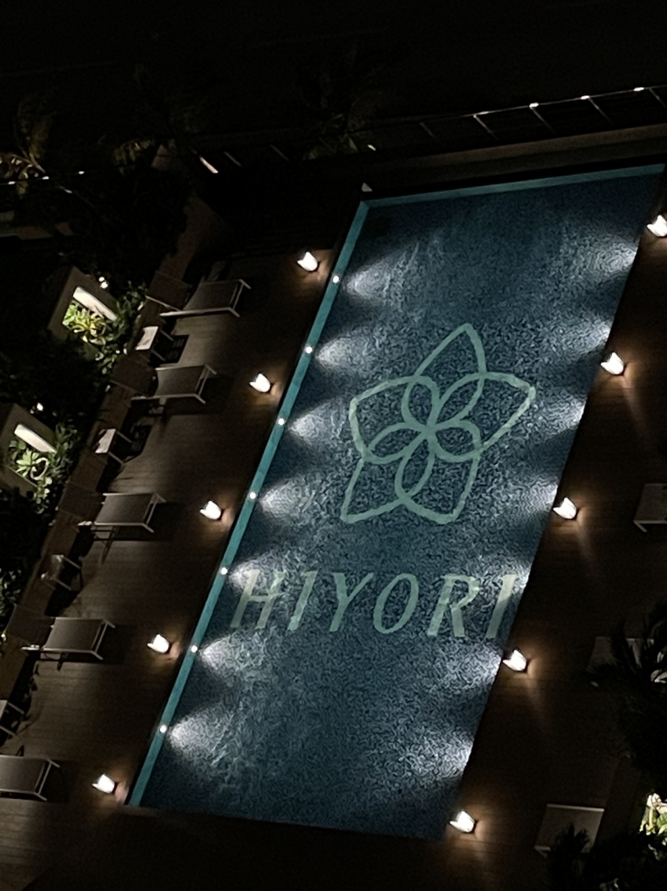 夜に部屋から階下のHIYORIロゴのプールはとても幻想的でロマンチックでした。