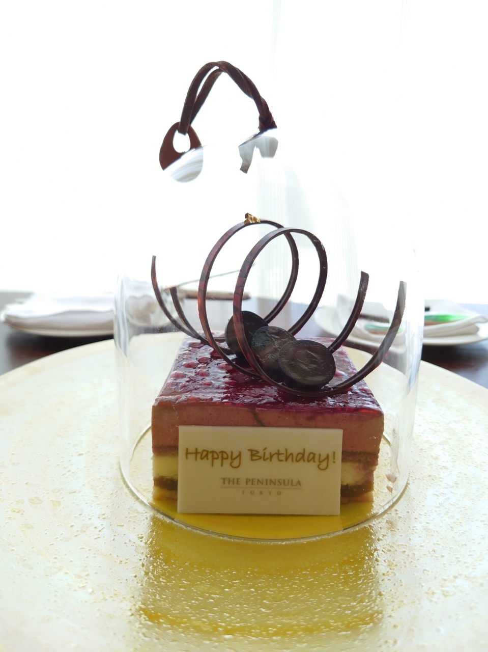 有楽町側の新幹線や銀座が見える側、東京駅や日比谷が望める側、みんな素敵です。部屋はとても広くて重厚でキレイ。窓側に椅子とテーブル。TVの前にソファがあって便利。広いバスルームはシャワーは別。今回はアメニティが変わってから初めてだったのですが、アルミのチューブは意外に使いにくいので私は前の方が好みです。残ったものをいただいて帰えろうと思ったら重かった。今回は娘の誕生日。ホテルのプレゼントはかわいいホールケーキ!