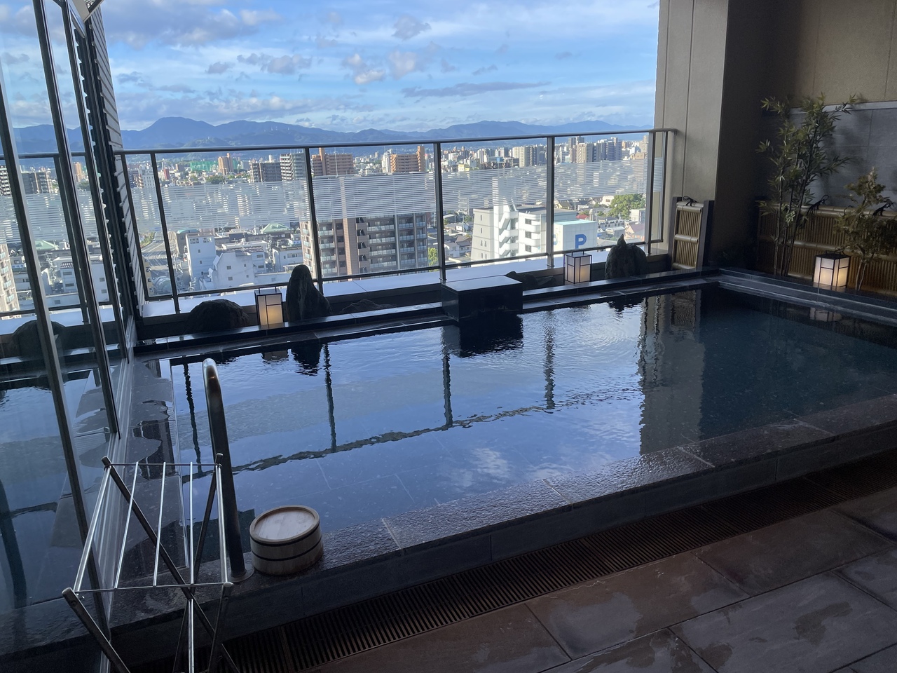 最上階にある大浴場がとてもよくて、夜には松山城のライトアップも見られました。