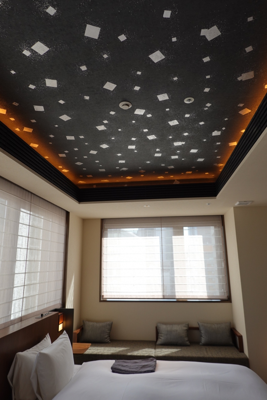 歌舞伎座に近い東銀座駅近くに最近できたホテルです。銀座や築地にも近く観光の拠点としては申し分なくその割に値段も手ごろでコスパの良いホテルです。広めの部屋に宿泊したところ奥まったほうのベッドルームは天井が星空を思わせるような和柄で、ブラインドも和紙風で落ち着ける空間でした。