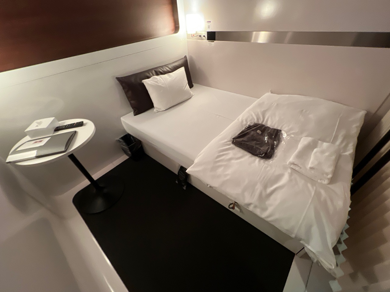 朝6時15分発のフライトだったため、空港内にいた方が安心かと思い宿泊してみました。ファーストクラスだとテーブルやスーツケースを広げる空間もあるので広々しています。とはいっても音が響くためあまり荷物整理などもできないですし、キーを打つ音が響くと思ってノートパソコンを広げることもできませんでした。結局寝るだけになるのでベッドだけのビジネスクラスで十分な気がします。蒲田のビジネスホテルの方が安いし個室だし、京急だったら15分で着くのでいいとは思いますが、ギリギリまで寝て、エスカレーター1階分上がるだけで出発ロビーに着くのは思った以上に楽でした。フロントで小さな音だったらアラームを使ってもいいと言われたのですが、確実に起きるために大きな音で鳴らしたいと思ったのと、簡易宿泊所なのに価格が高いのがネックだと思います。