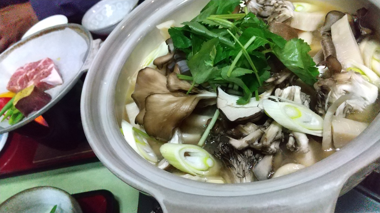 キノコたっぷりの鴨鍋は4人分はあるボリューム。焼き立て熱々で運ばれ頭からしっぽまで食べられるように丁寧に焼かれた岩魚。具だくさんの茶碗蒸し、デザートの蕎麦のアイスクリームは他とは違う濃厚な味わい。山の旅館でこれほど充実したお料理がいただけるとは想像していませんでした。