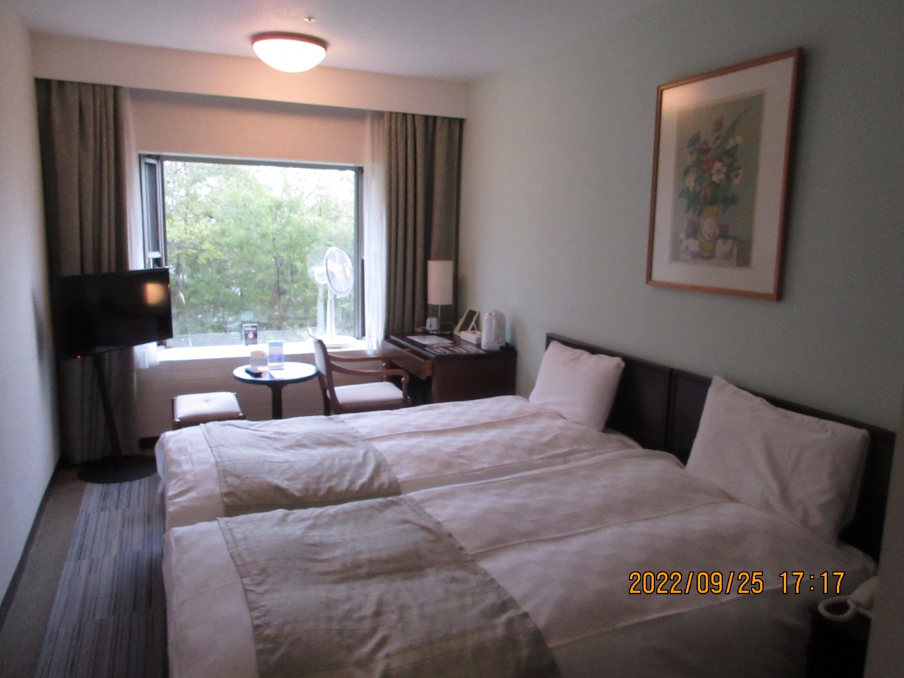 東館の部屋をアサインされたが、1階だったので窓からの眺望は伸びている樹木が邪魔をしていて風景を楽しめなかった。部屋の広さが19.2㎡しかないことは事前に知っていたので特に大きな不満はなかったが、部屋備え付けの浴室の狭さはやや不自由さを伴うものであった。