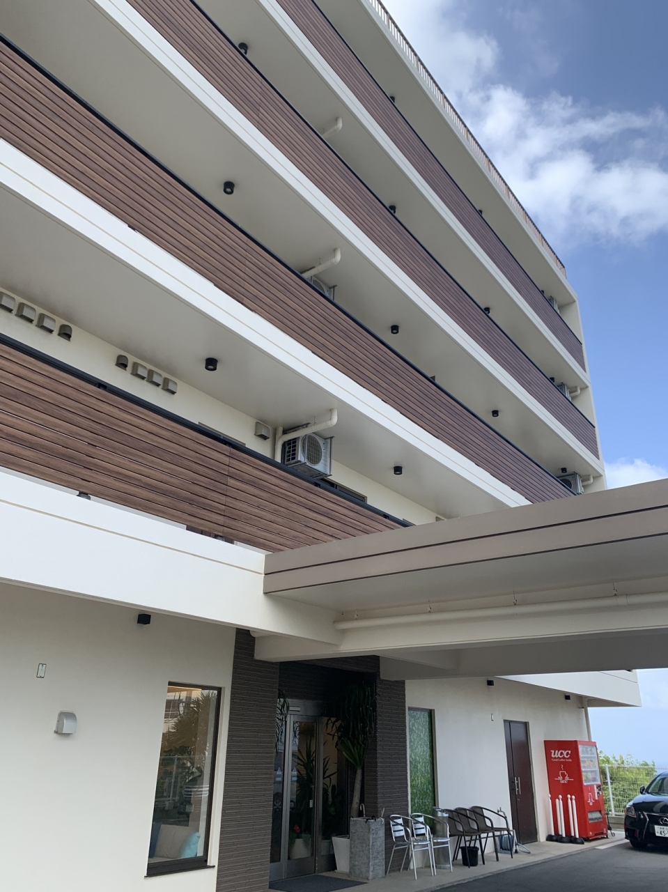 美ら海水族館のある海洋博記念公園から近い場所にあります。無料駐車場あり。1階でチェックインを済ませてエレベーターで4階の部屋へ。