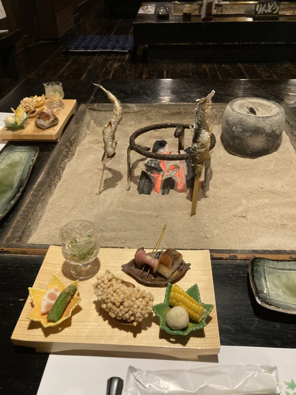 お食事は川を渡った先にある建物で囲炉裏を囲んでするスタイルでなかなか面白く、バラエティ豊かでどれも美味しかったです。