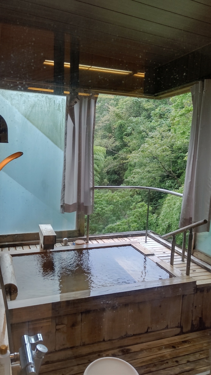 天然温泉掛け流しで有名な観音温泉に宿泊しました。各部屋にも掛け流しの露天風呂がついています。お湯は透明でツルツルしており翌日は肌がつやつやになりました。料理は海の幸がメインで肉は無かったです。自分ですりおろす生わさびが美味しかったです。