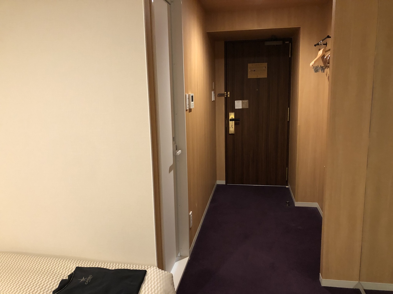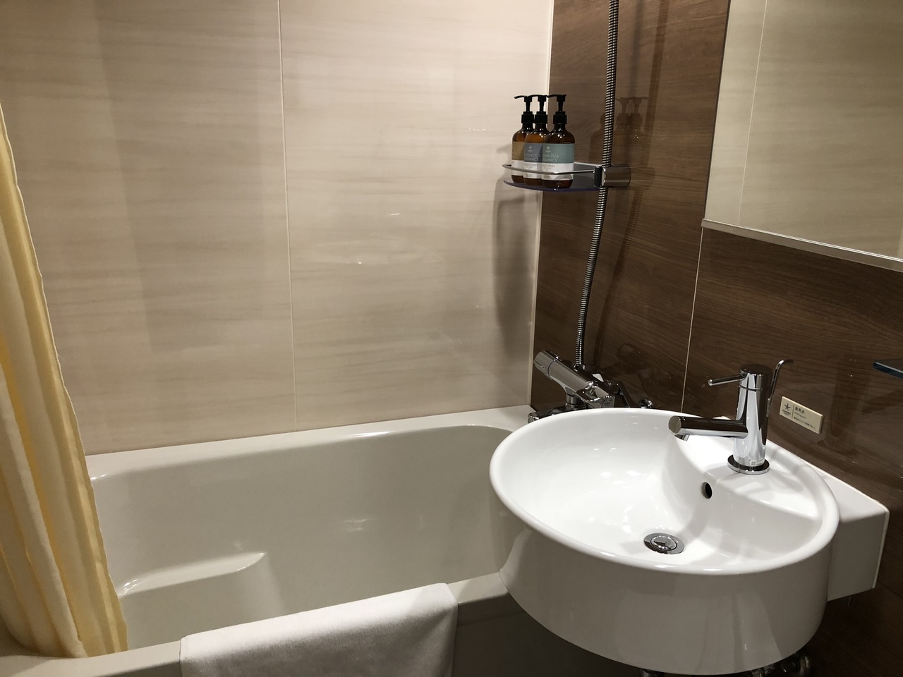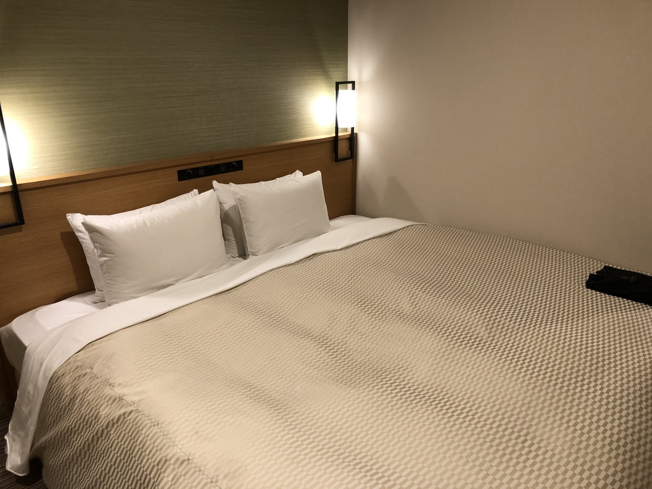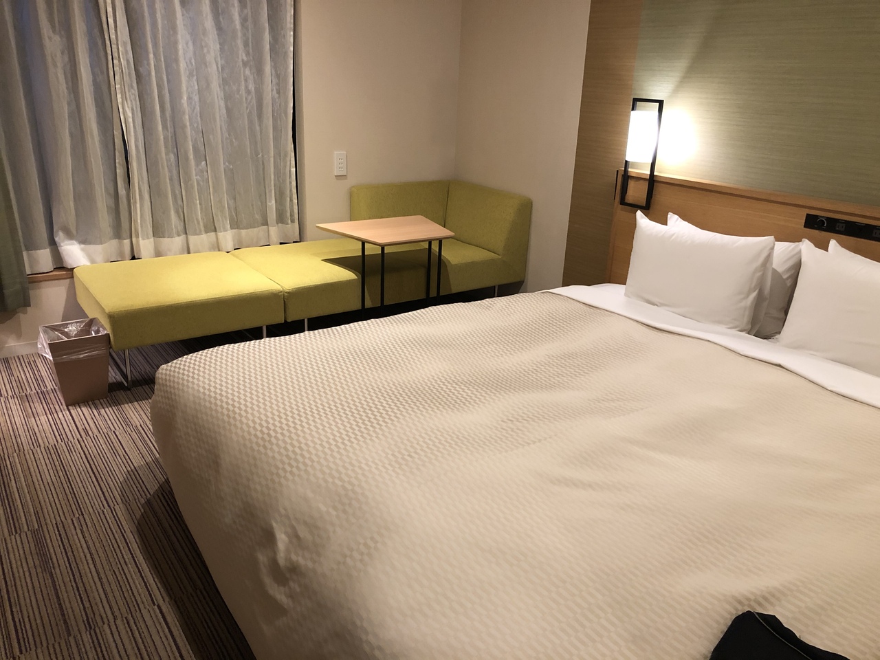 客室は、シンプルで、少し広めの配置と大きな窓により開放感があります。宿泊したのは、価格の安い「スペーリアソファークイーン」(ダブルルーム)で、広さ16㎡の一般的なお部屋ですが、横になることができるサイズのソファーと、シモンズ製の1600㎝のベッドは広々としていてありがたい。一方で、大浴場があるのでトイレしか使いませんが、水回りはシテイホテルサイズで広くはありません。また、無料の水がないのも残念。