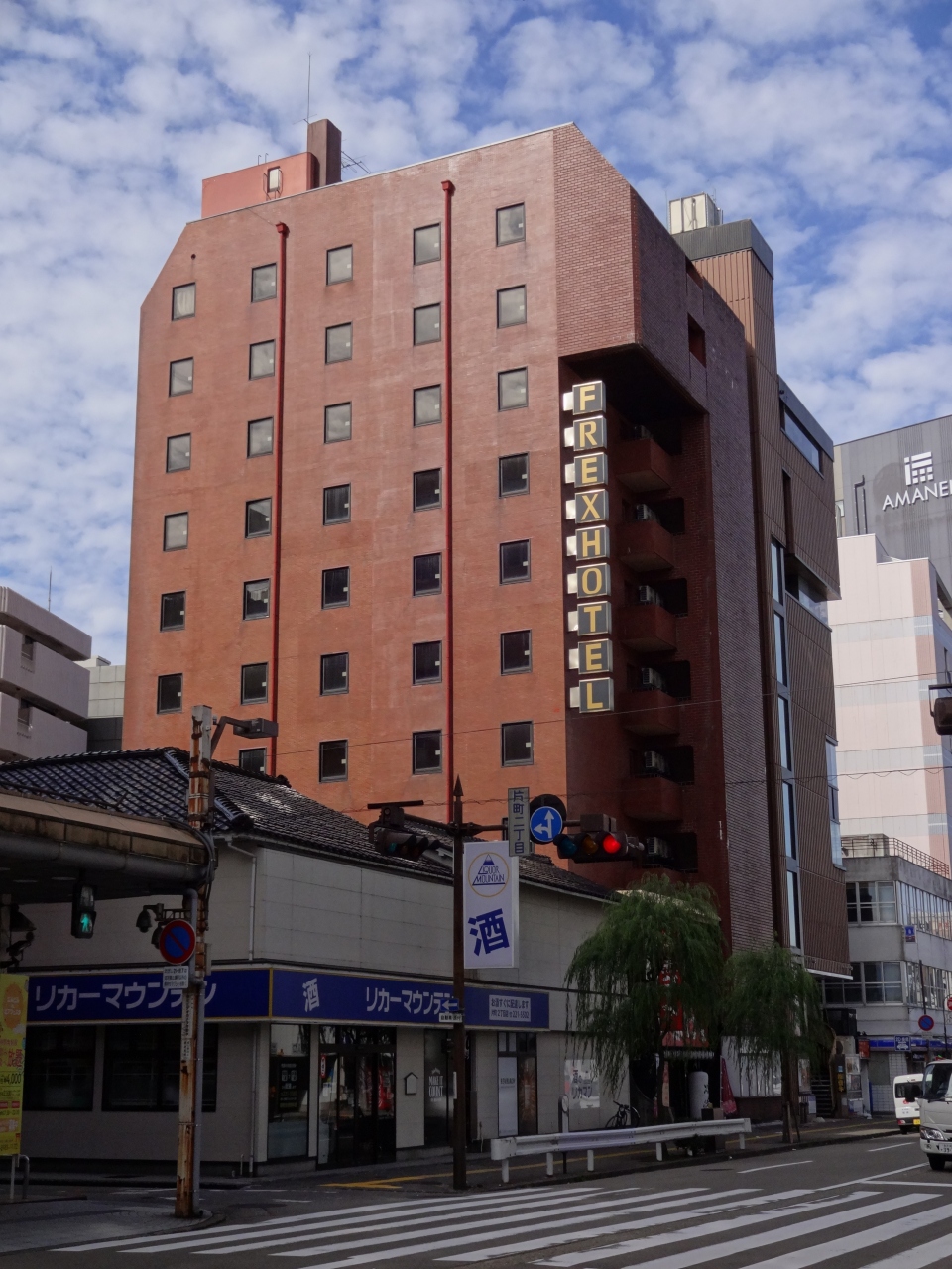 金沢城公園や兼六園、にし茶屋街など10分くらいで行ける距離だが、ホテルの周りはパチンコ、クラブ街なので、ちょっと五月蠅い。提携駐車場は少し奥まったところにあったので、一歩通行の細いが多い中、少々難儀したが、チケットでかなり安くなり助かった。部屋はコンパクトだが圧迫感はないものの、ライティングデスクがなく、薄暗い室内照明で書き物をするはめに。風呂の広さは普通だが、浴室換気扇が回っていなかった。また、ベッドのスプリングがヘタっていたこと、エアコンの温度設定ができなかったことが残念。