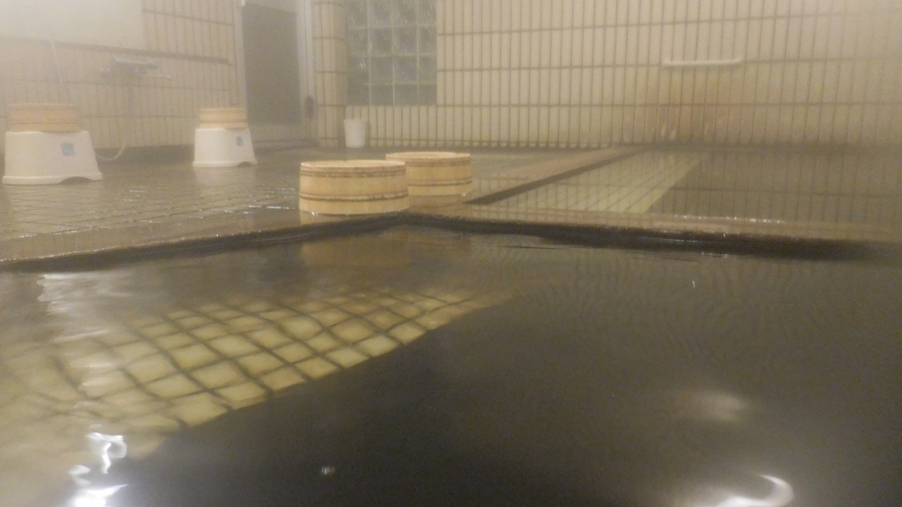 浴室には大きな湯舟が2つ。「総重曹泉」と「含食塩・芒硝・重曹泉」の2つの異なる源泉で温度が高いので加水して循環なしのかけ流し。お湯はやや茶色がかりわずかに油臭。この油臭は東鳴子温泉の特徴のようだ。