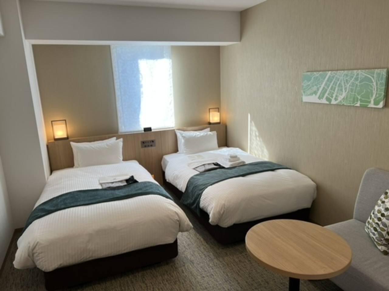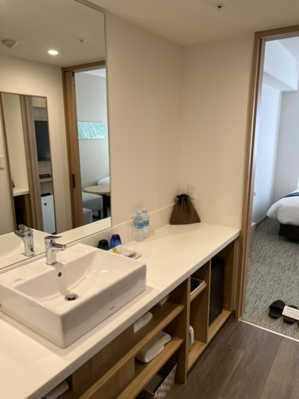 市電八丁堀駅から徒歩5~6分。2019年にオープンしたばかりの綺麗ばホテルです。駐車場は建物の反対側にあり、立体駐車。出し入れには少し時間がかかります。客室は落ち着いたデザインで掃除もしっかりされており、快適に過ごす事が出来ました。スーペリアツインの部屋に泊まったのですが、洗面台が通路部分に設置されており便利でした。(スーペリアハリウッドツインはトイレの中に洗面台がある謎構造なので、普通のツインがおすすめ)このホテル、ラウンジが無料で使えるのも非常に良かったです
