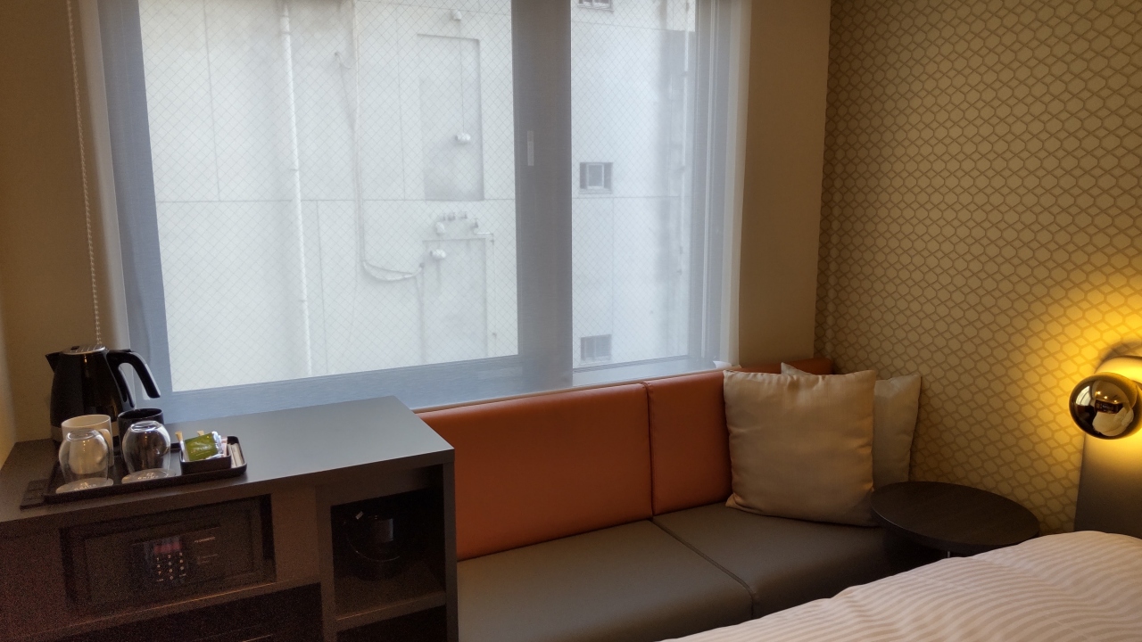 難波駅から徒歩で5分くらい、新しいホテルです。周りは再開発予定でしょうか、廃墟の様なビルなどあり、あまり雰囲気がいいとはいえませんが。wifiは部屋ごとにあり、十分な速度です。ツインルーム利用で窓際にソファーがありました。