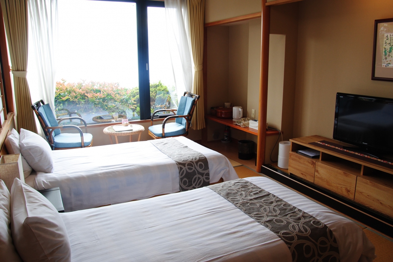 部屋の窓から遠くに見える半島は兵庫県の城崎あたりのようです。