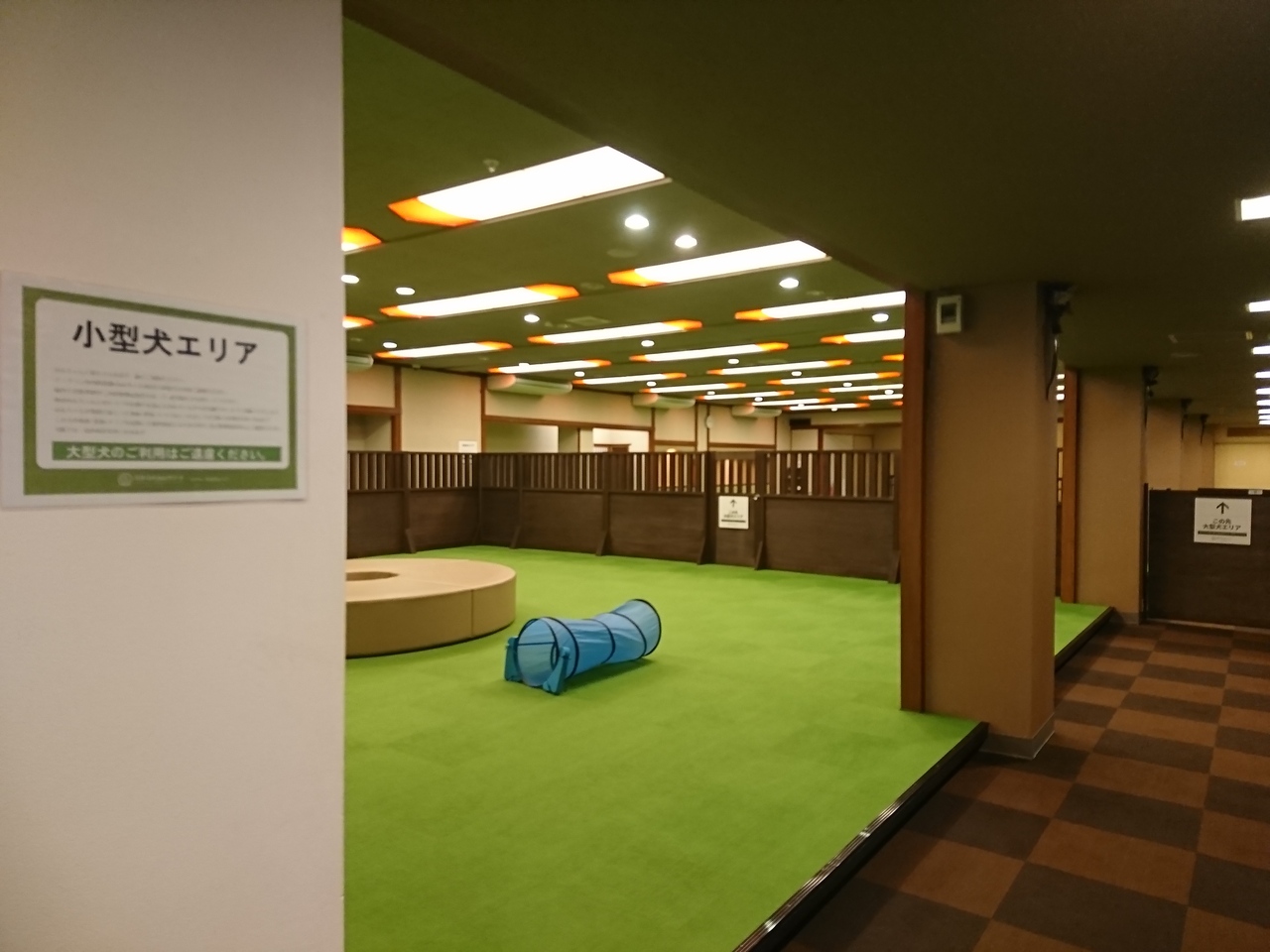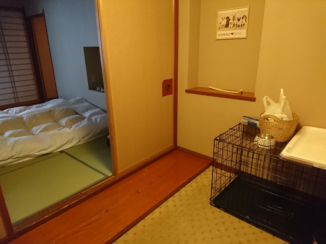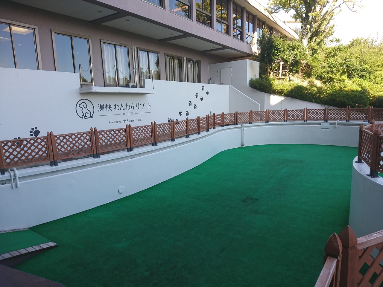 こちらは湯快リゾートの中で愛犬と同泊できるようにリニューアルされた初代のホテルになります。ホテル内の共用部をワンちゃんはリード着用で自由に連れて歩く事ができますが、食事の際は、別のホテルに移動する必要があるため、先日お世話になった同系列の粟津と違い、ワンちゃんは部屋のゲージの中で留守番する事になってしまいます。わかっていた事ですがそういう点で可哀想で未完成という印象を持ちました。粟津と違う点として、屋外ドッグランやカラオケ、卓球台などの設備があります。スタッフの方は皆さんワンちゃんに優しく接してくれるので気兼ねなしに過ごせます。今後もこのようなペット同泊ホテルが増えてくれる事を願っています。
