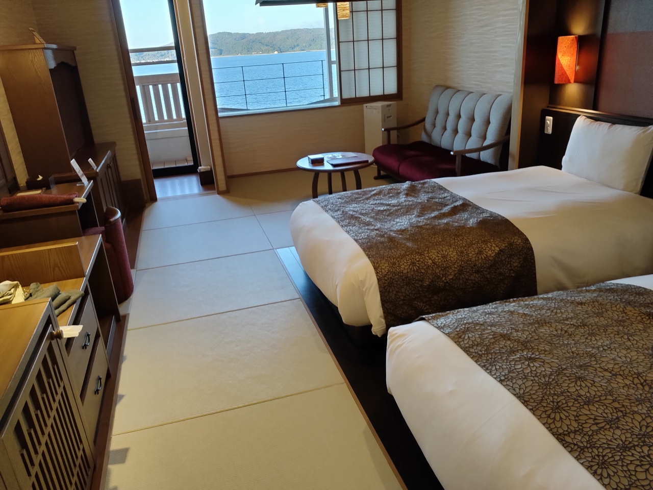 ホテルは1年ほど前にオープンということで、館内、部屋など新しくてきれいです。部屋は広く部屋風呂があり、ゆったりと入浴時間が過ごせます。部屋からは能登湾の美しい景観が楽しめます。館内はすべて素足で歩くとになっており、思いのほか快適でした。食事は夕食などは種類が多く楽しめました。サービスは不慣れな点がいくつかありました。