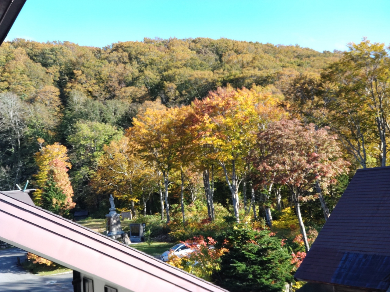 - ロッジ風の洋室、窓からは絶景の紅葉
