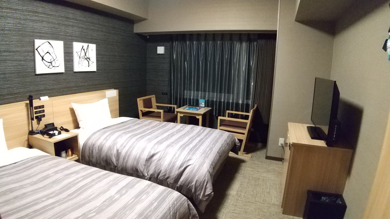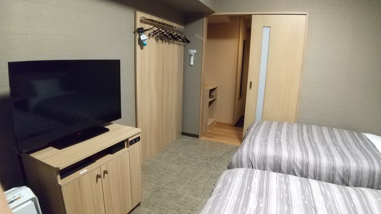 建物は本館と東館に別れていて、今回宿泊した東館は客室に靴を脱いで上がるタイプで、旅館のようにくつろげました。TVのリモコンで大浴場や朝食会場の混雑具合、コインランドリーの使用状況が分かるのが便利でした。室内はそれほど広くはありませんが、清潔で機能的です。