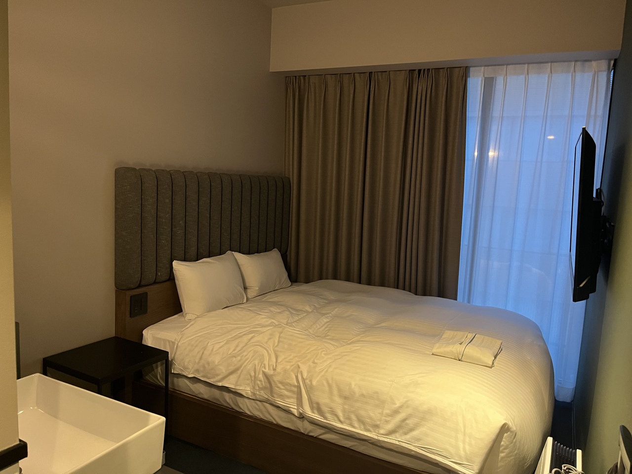 出張時に三泊しました。比較的新しいビジネスホテルで、大きめのダブルベッドやあえて、バスルームとは別に作られた水回りなど、拘りを感じますが、バスタブがなく、シャワーのみなので、連泊はきつかったです。デスクスペースも小さく、出張利用には向かないかなと思いました。