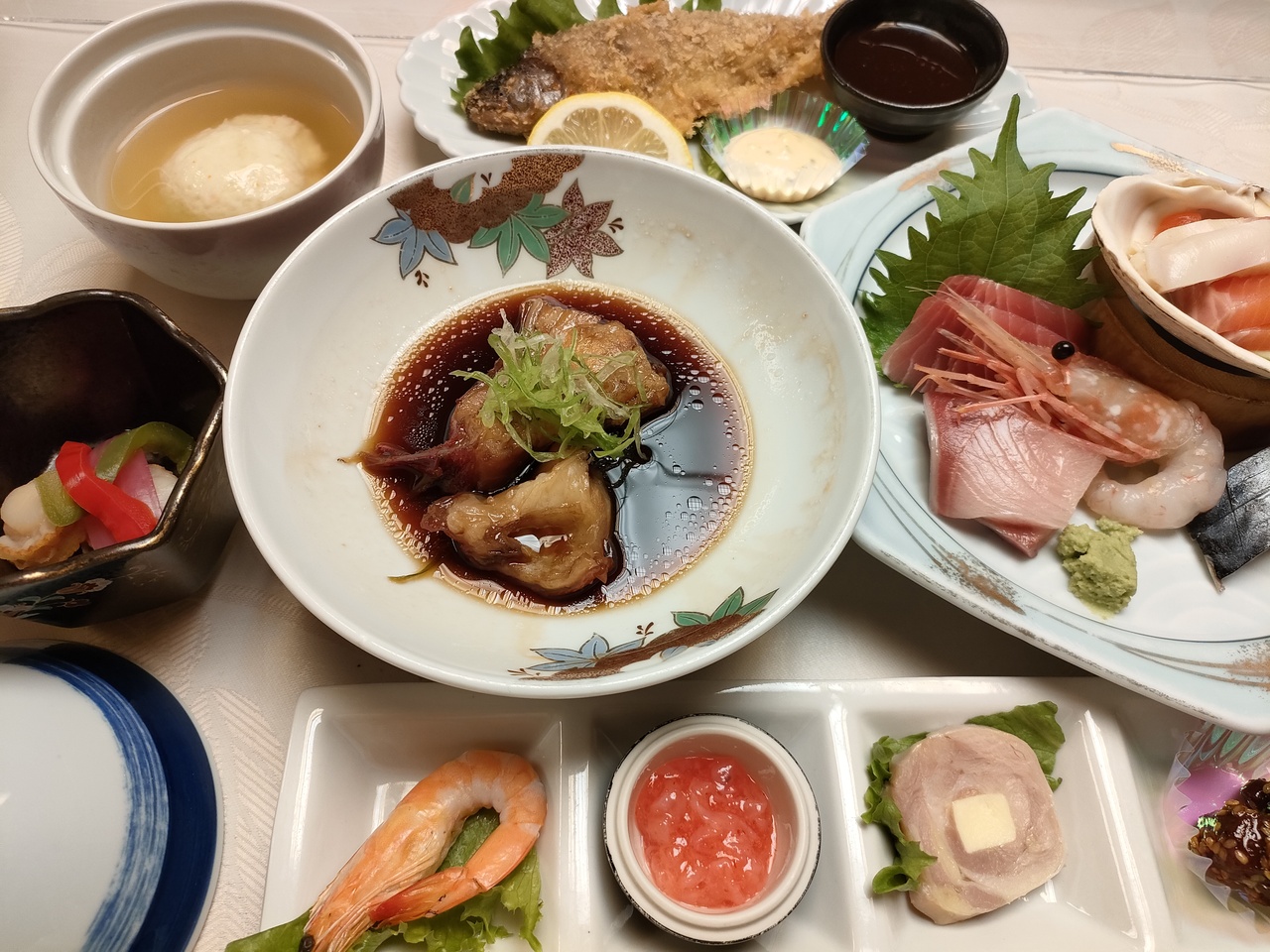 食事も、素材を活かした海の幸、特にこのあたりのタラコが最高です。朝食には、たらこ出汁茶漬けがあり、お出汁の美味しさとあいまって、ご飯が進みました。