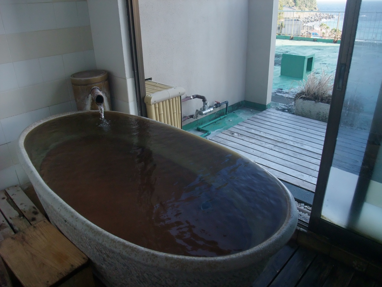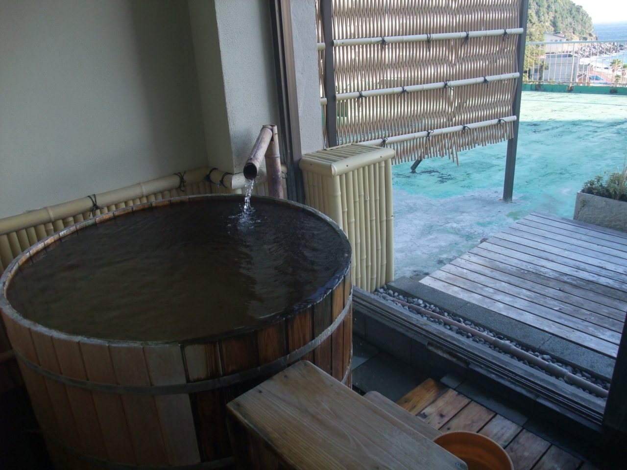 屋上展望風呂は、予約なしでの貸切で、熱川の海が一望でき、海を隔てて伊豆大島も見られます。