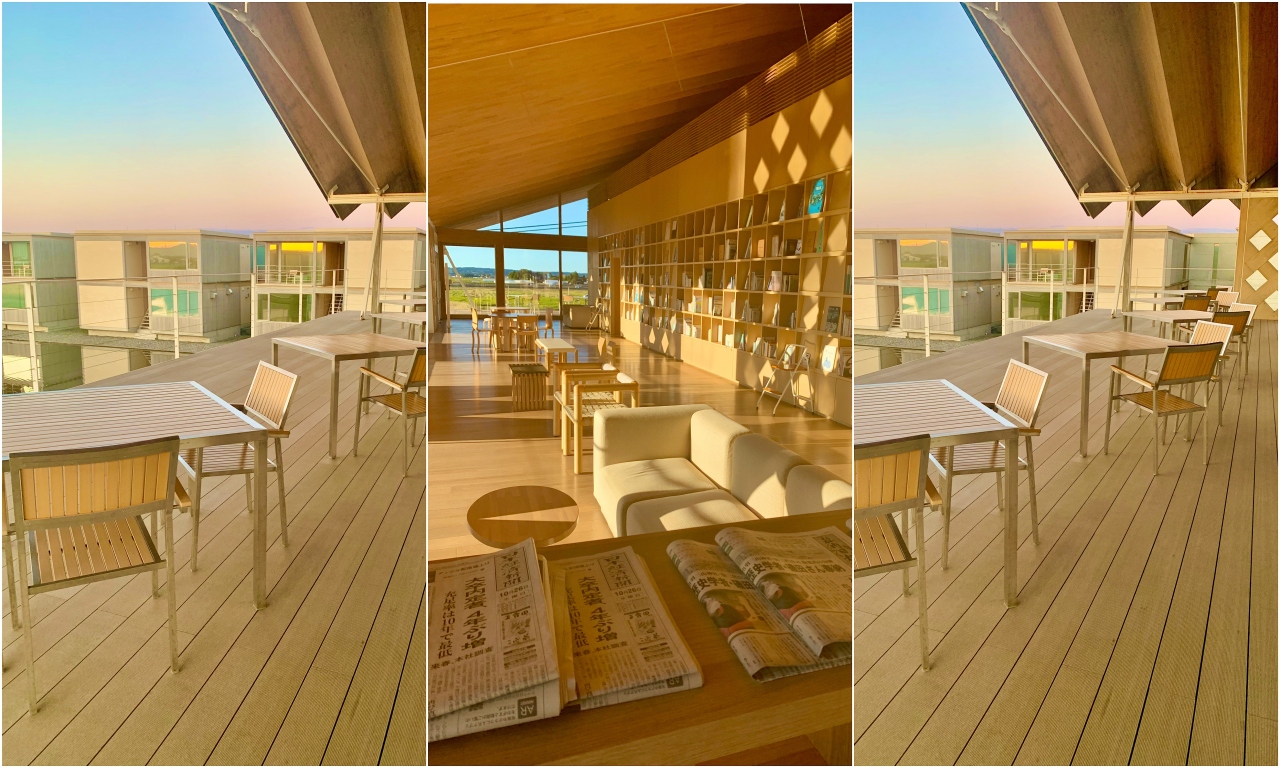 共用棟にある広いフリースペースは、長ソファやセーブルセットが設置されていて、時間ともに変化する陽射しで雰囲気が変わり、特に朝陽の当たる時間帯や夕暮れ時の時間帯には、田園がとても美しいです。