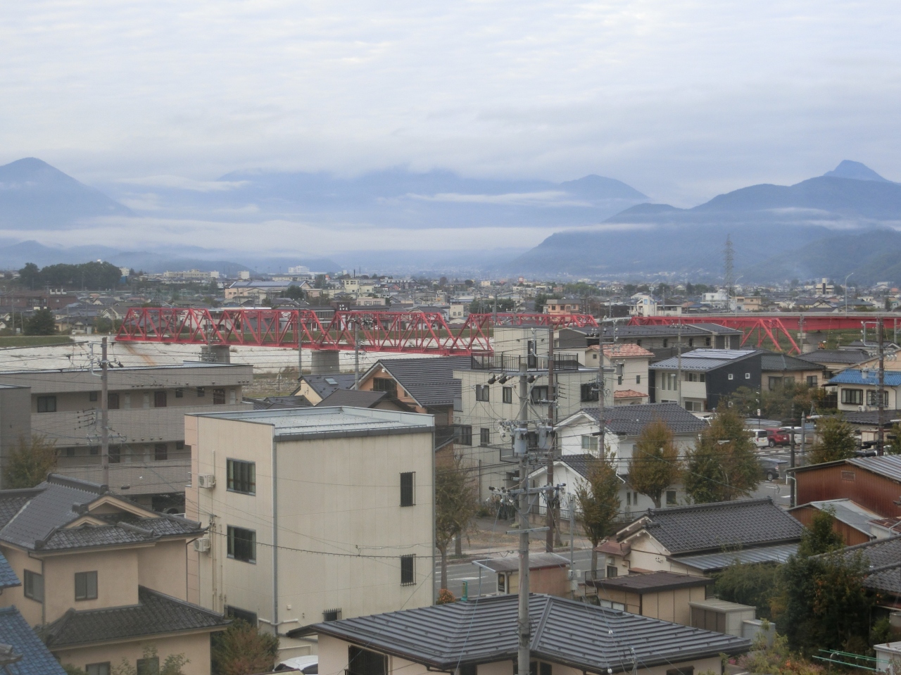 部屋から集中豪雨で流れてしまったけど再建された千曲川に架かる上田電鉄の赤い橋が見えます。
