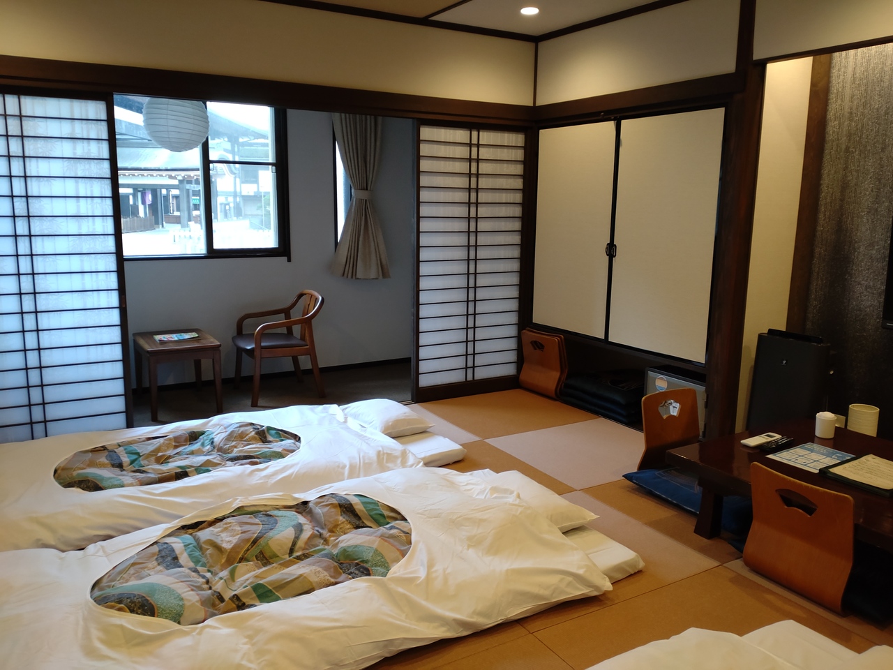 成田山新勝寺の門前に建つ歴史ある旅館です。フロントはレトロ感が残っていて良い雰囲気です。客室はきれいに改装されており、窓からは参道と新勝寺の境内が見えます。大浴場は小さいですが、こちらもきれいに改装されていて不快な感じはしません。チェックインしたら既に布団が敷いてあったのにはちよっと驚きましたが、参拝で疲れたところですぐに横になれたので良かったです。早朝の成田山公園散歩もここからならすぐですし、立地を考えるとお得感のある値段だと思います。成田山に来る際はまた泊まりたいです。