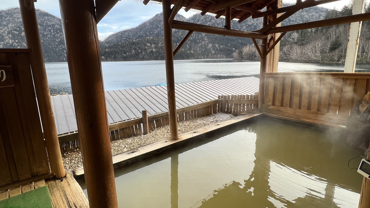 浴室に入ると温泉の匂いがして、緑色の湯がかけ流されています。硫黄とも違う鉄分のような匂いで温泉の雰囲気があります。湖に面した露天風呂もあり景色は良いですが、肩まで浸かってしまうと塀しか見えないのが少し残念でした。温泉成分が濃く、とても良い湯であるのがわかりました。