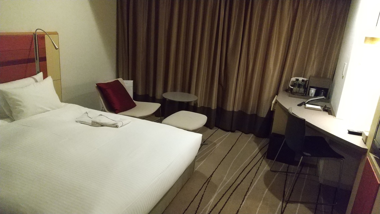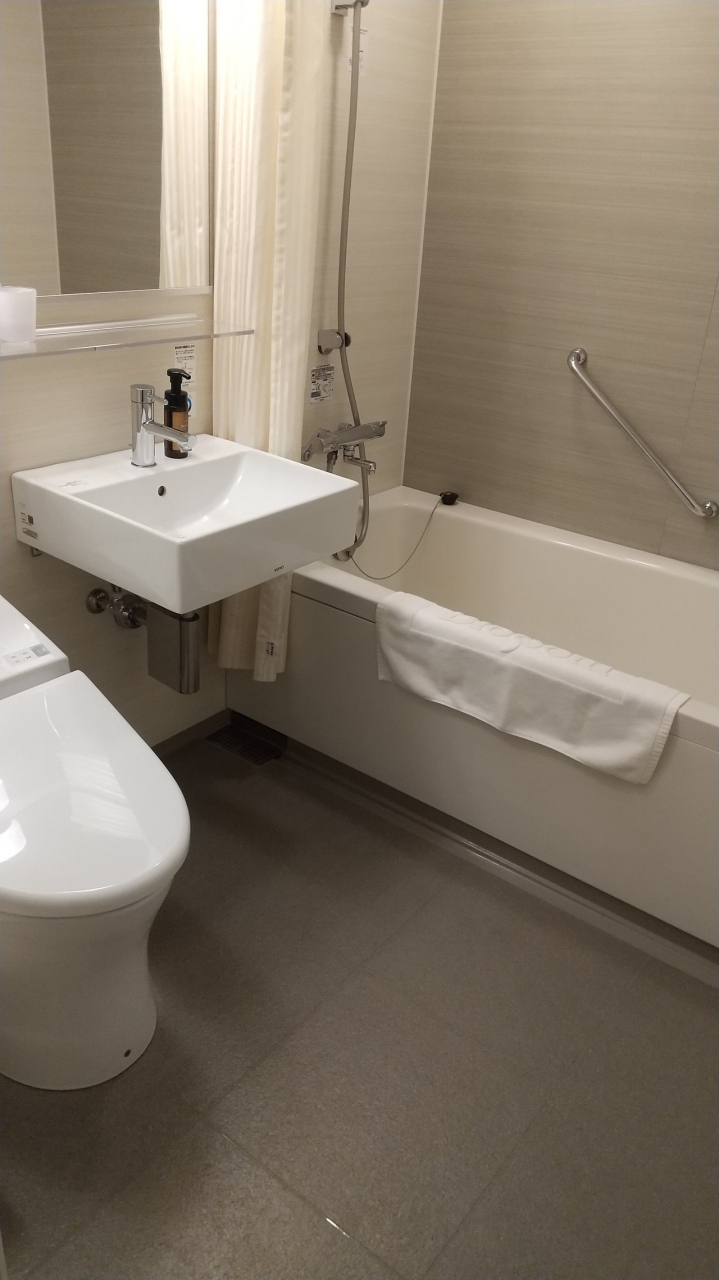 ビジネスホテルだけど、部屋は広め。浴室も広い。バスタブは浅くて長い。
