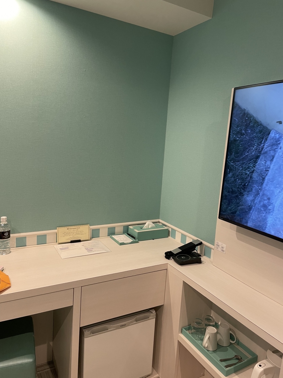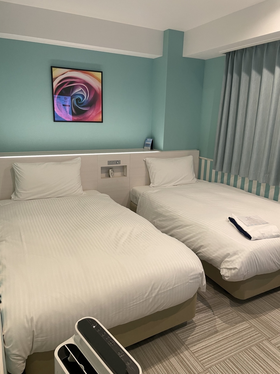駅から少し歩きますが、綺麗なホテルでした。青ベースで、部屋もポップカラー。ベッドの寝心地が良かったです。確かエアウィーヴ。浴場もあり、ダイソンのドライヤー、シャワーのボリーナがすごく髪、肌に良いのを感じました。目の前にコンビニもあるし、近くにドンキもあるので、困らない立地です。